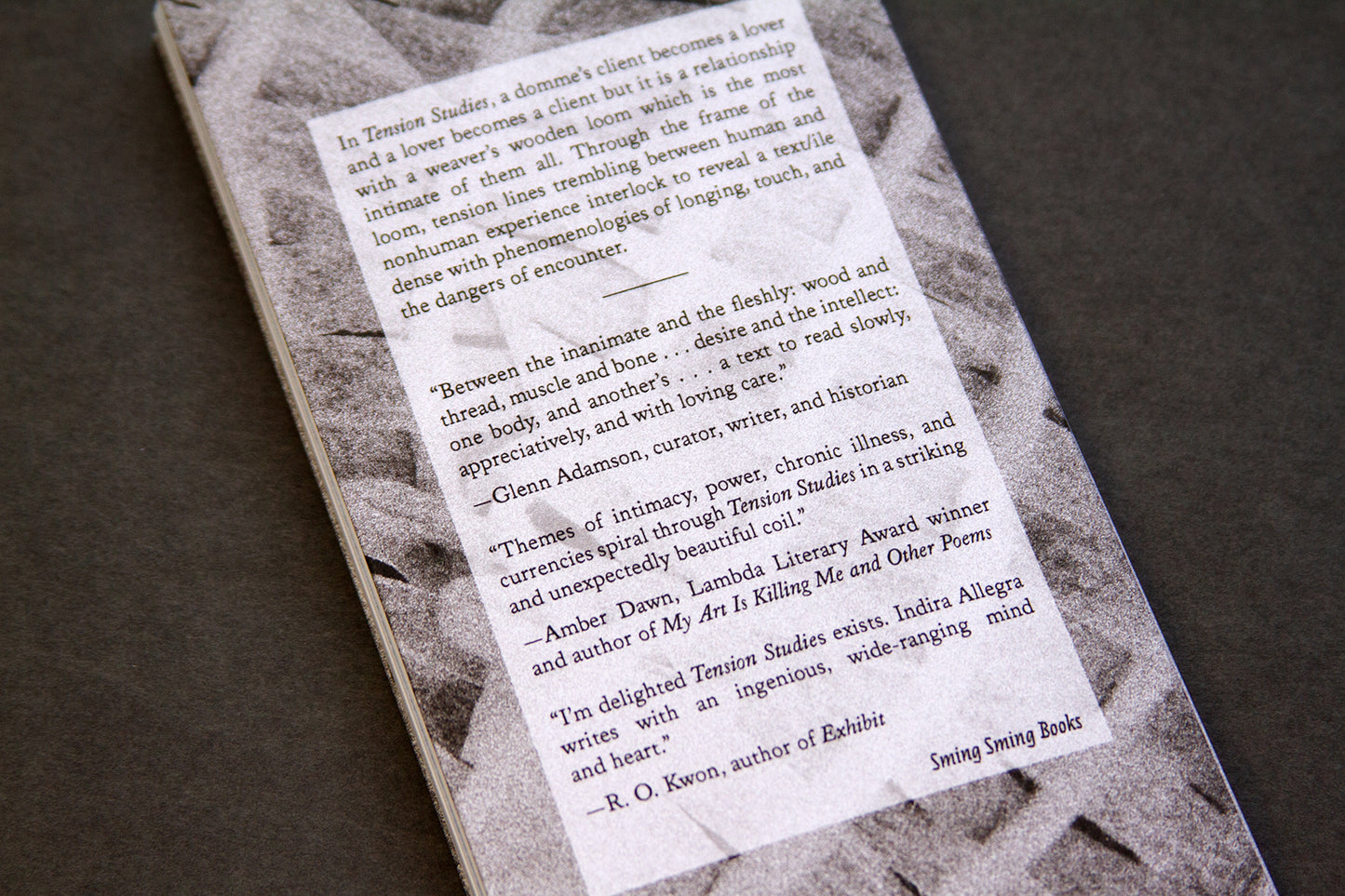 In Tension Studies, a domme's client becomes a lover and a lover becomes a client but it is a relationship with a weaver's wooden loom which is the most intimate of them all. Through the frame of the loom, tension lines trembling between human and nonhuman experience interlock to reveal a text/ile dense with phenomenologies of longing, touch, and the dangers of encounter.